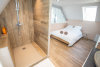 - 1 salle de bain ouverte dans la chambre avec meuble vasque, grand miroir, belle douche à l'italienne et lave linge
