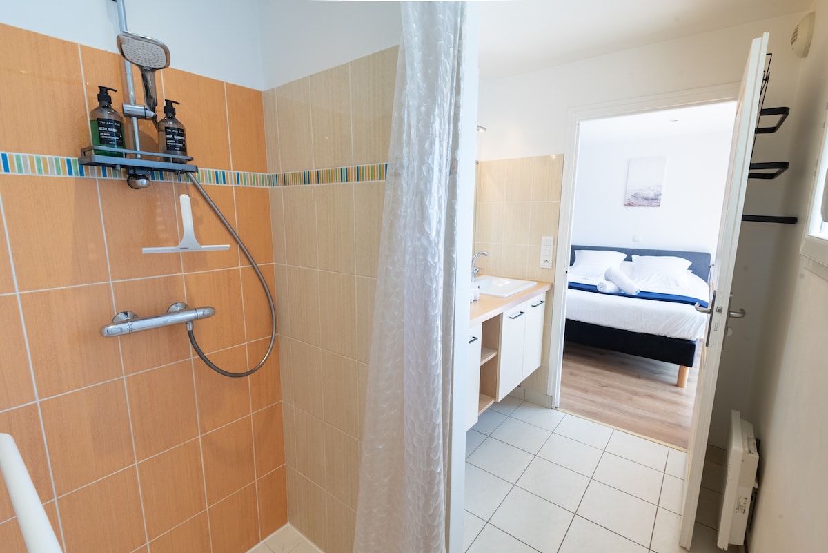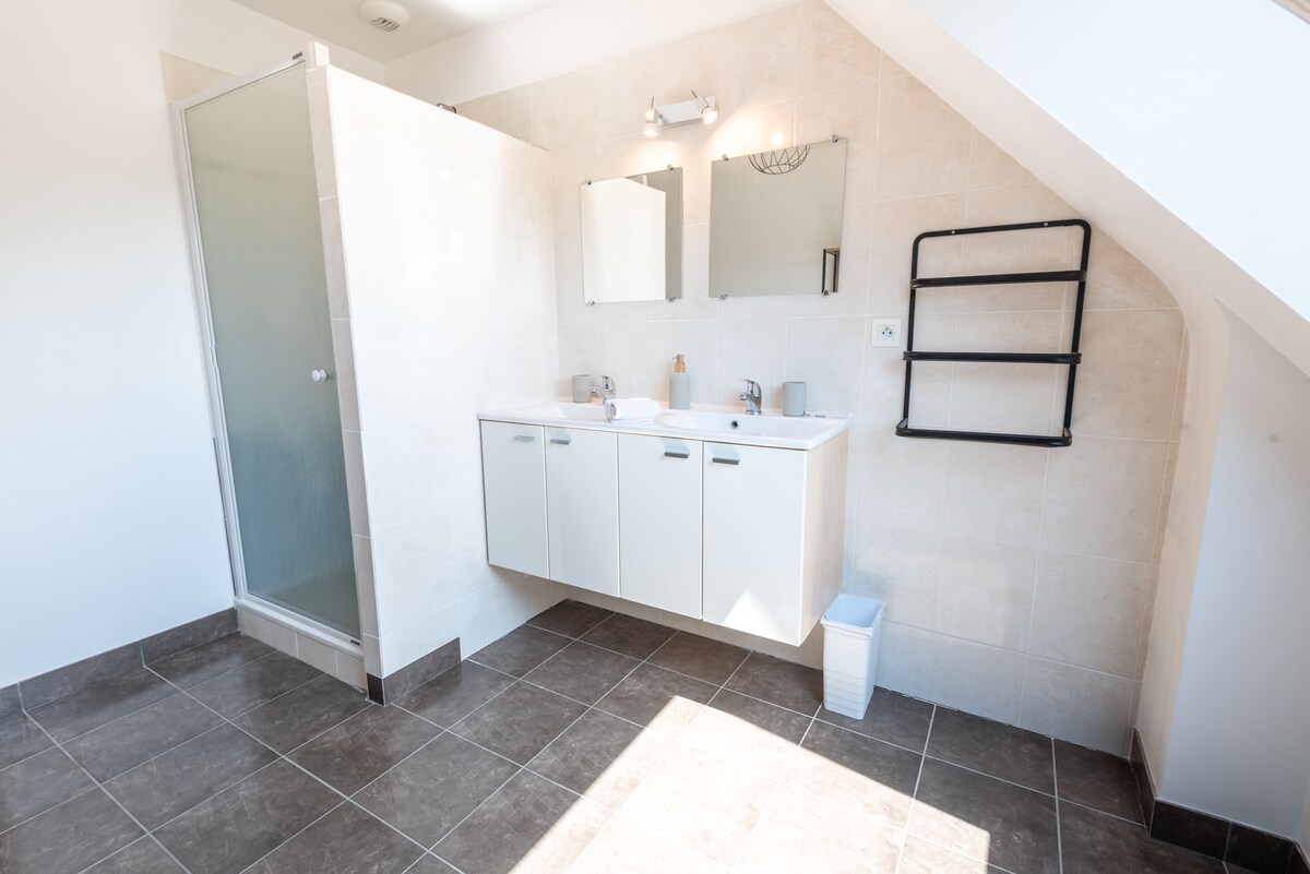 Une salle de bain privative donne directement dans la chambre avec meuble double vasque, douche et WC.