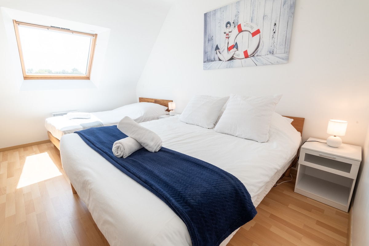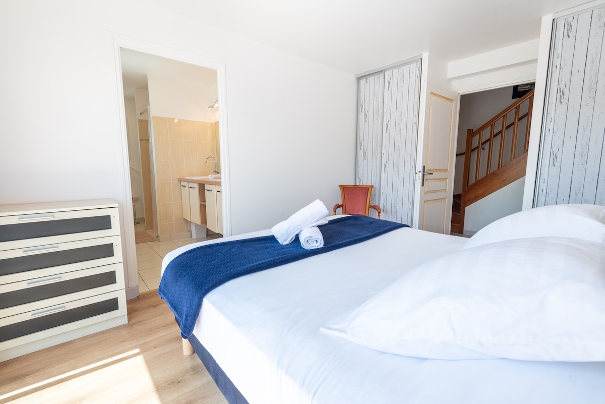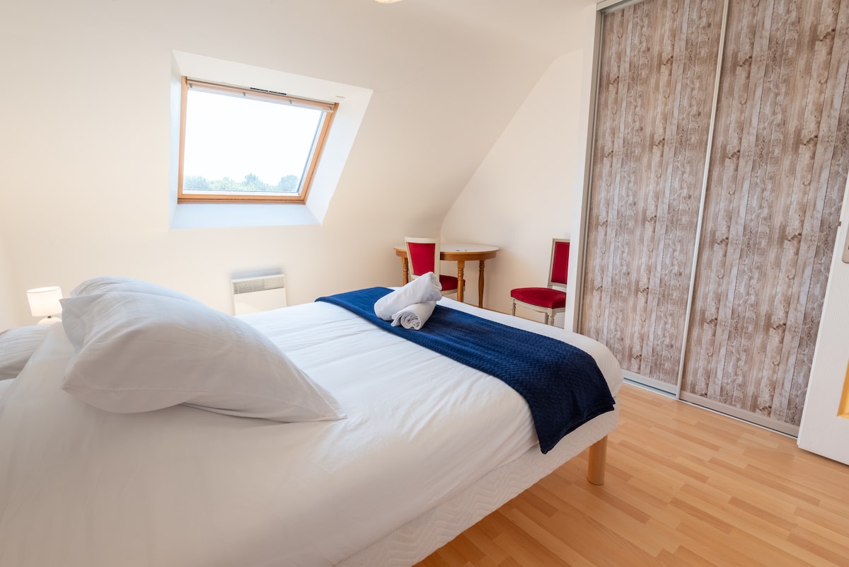 ○ Une chambre triple (1 lit Queen size 160cm + 1 lit simple 120cm) avec tables et lampes de chevets, rangements avec penderie, petit bureau, chaise et volet roulant.