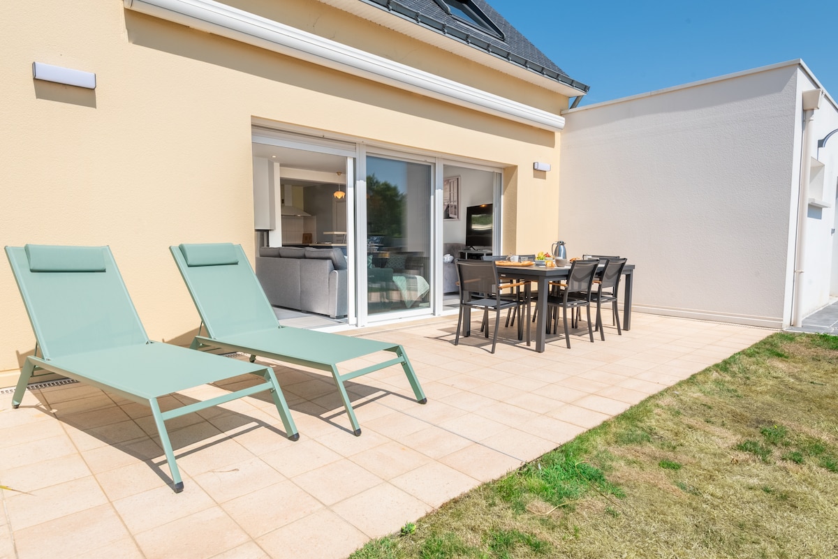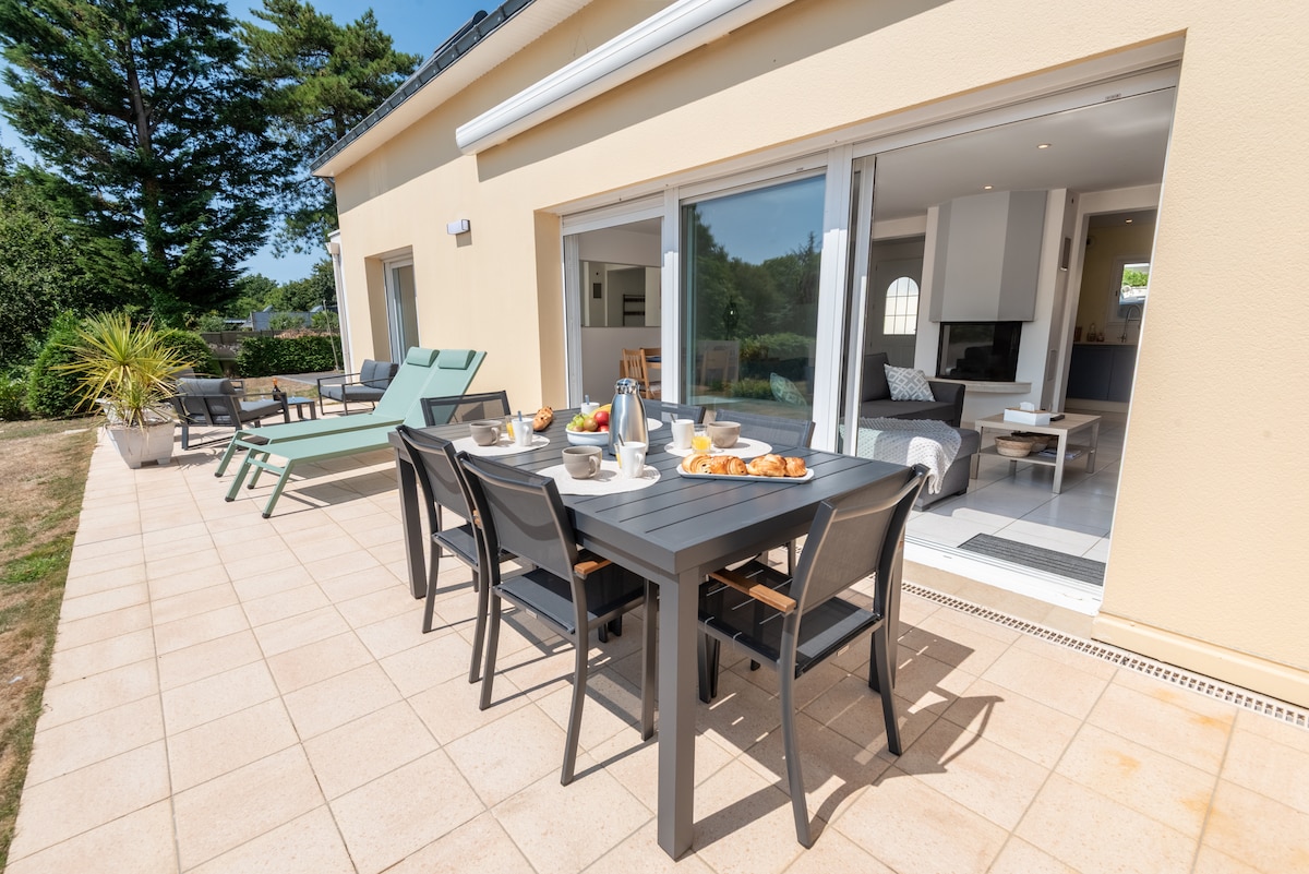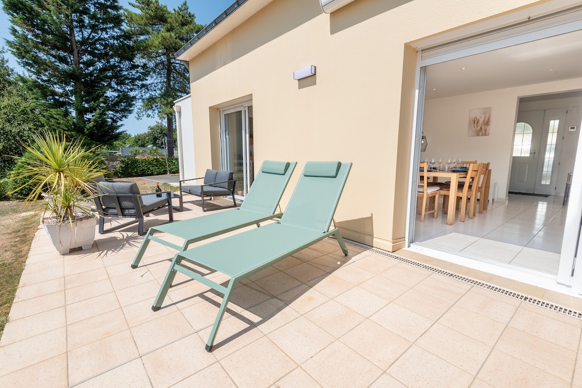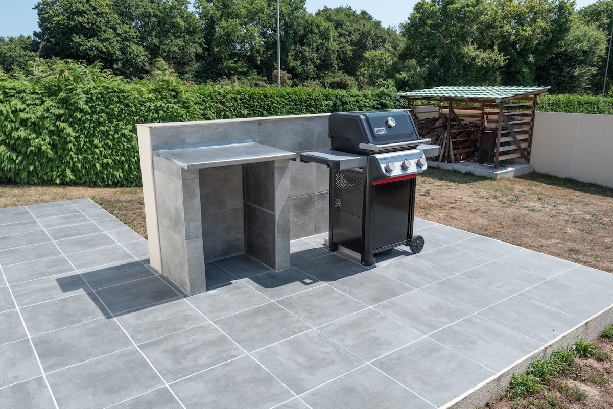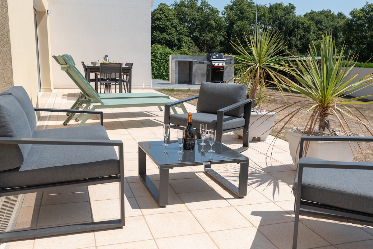 Vous trouverez à votre disposition un grand store pour créer de l'ombre, une table et chaises pour 8 personnes, un salon de jardin avec fauteuils et table basse, deux transats ainsi qu'un espace cuisine extérieur avec un barbecue Weber à gaz et un plan de travail en inox.
