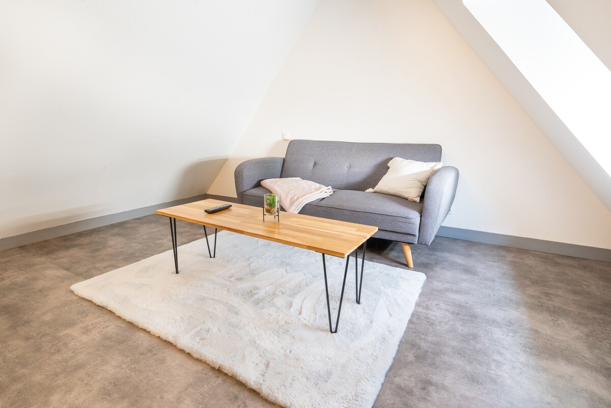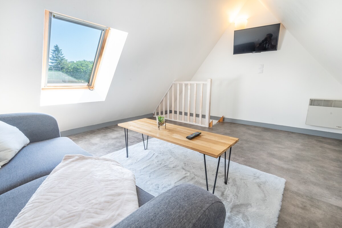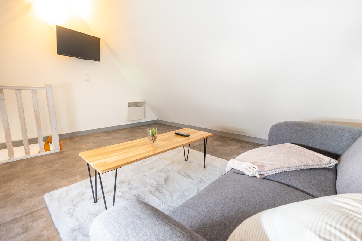 En duplex vous avez accès à une mezzanine faisant office d'espace d'entente avec un canapé, une table basse et un TV.