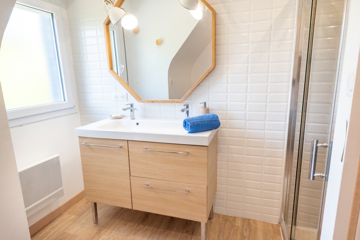 ► Une salle de bain avec douche italienne, meuble vasque, sèche cheveux, rangements.