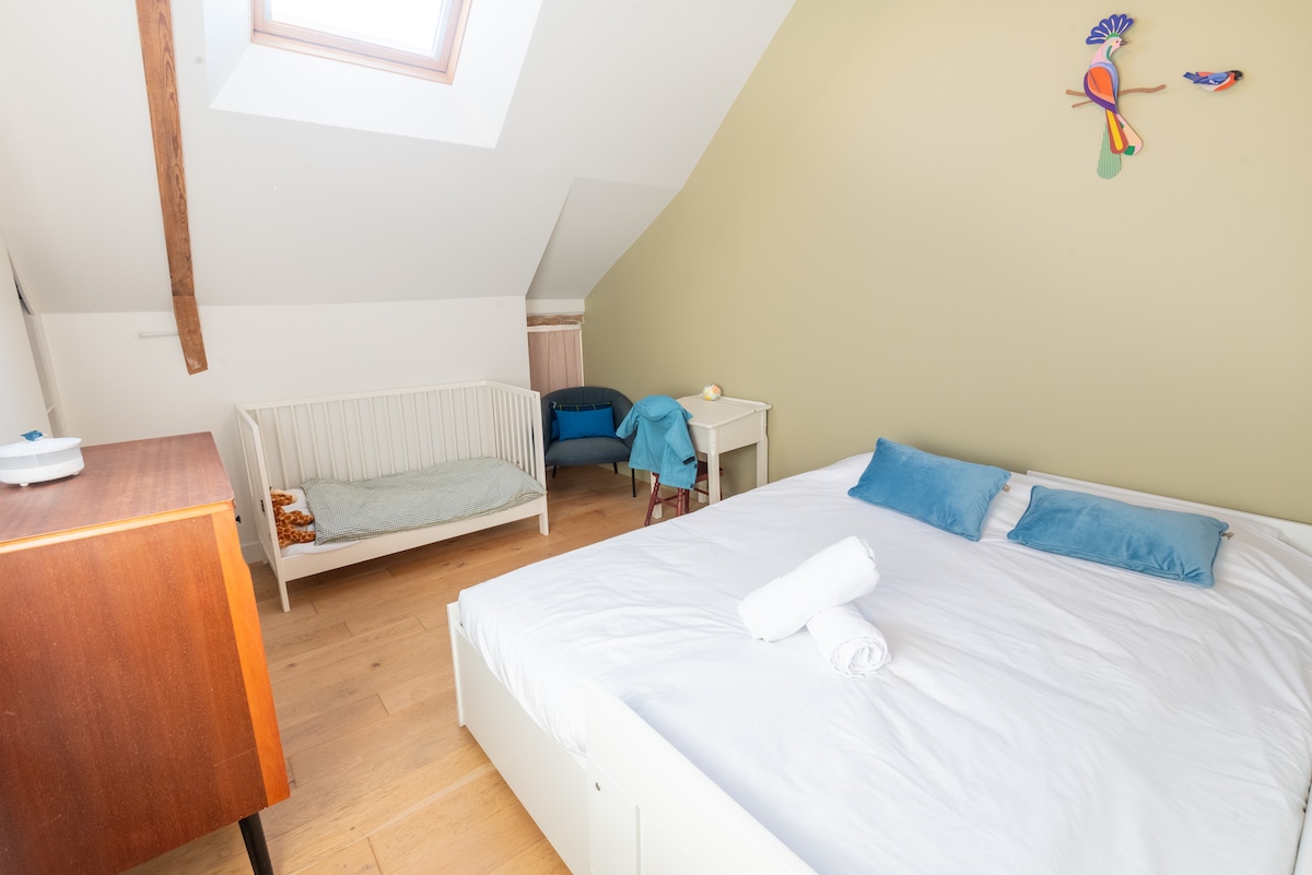 ○ Une chambre double (lit 180cm) (possibilité d'un lit 90cm sur demande) avec commode, un bureau avec chaise pour enfant et un lit à barreaux. Stores occultants.