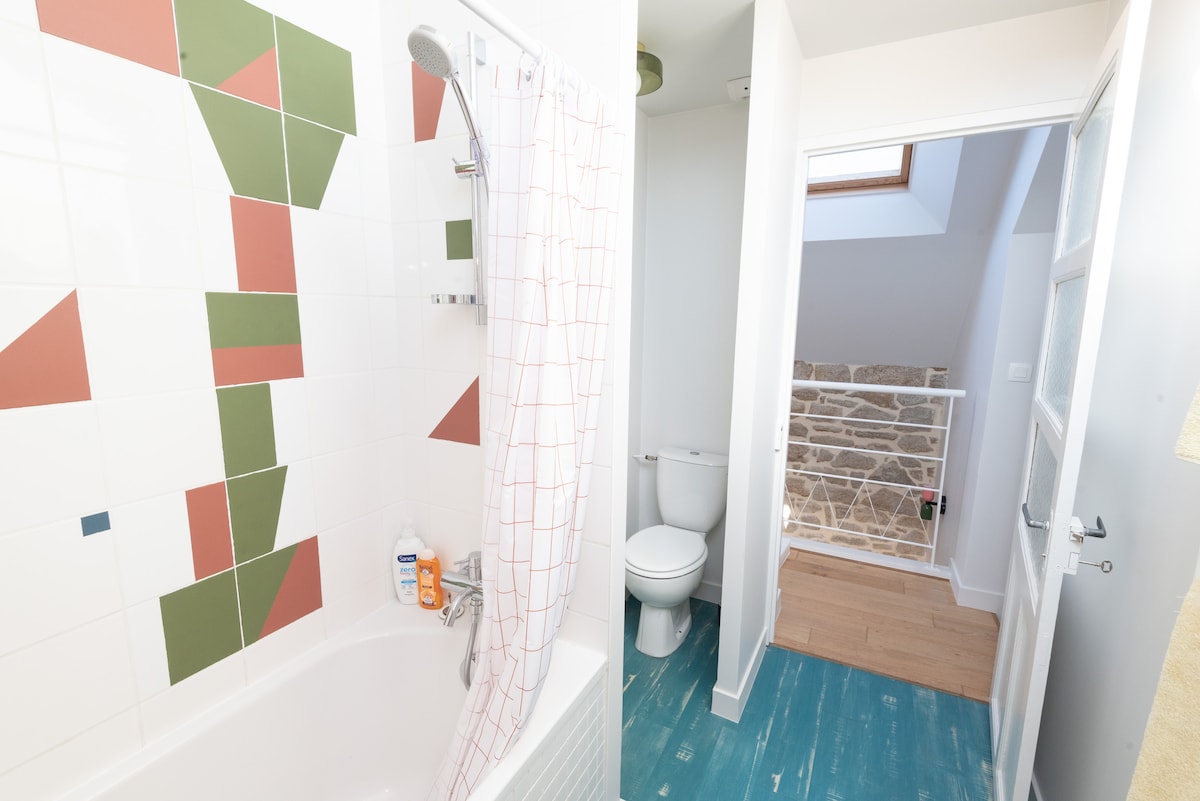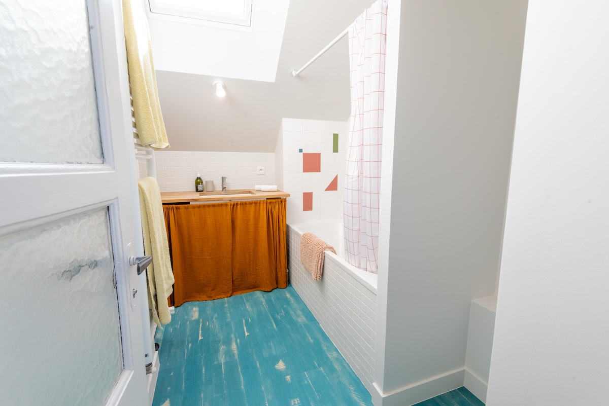 ○ Une salle de bain avec baignoire/douche, meuble vasque, grand miroir et un WC.