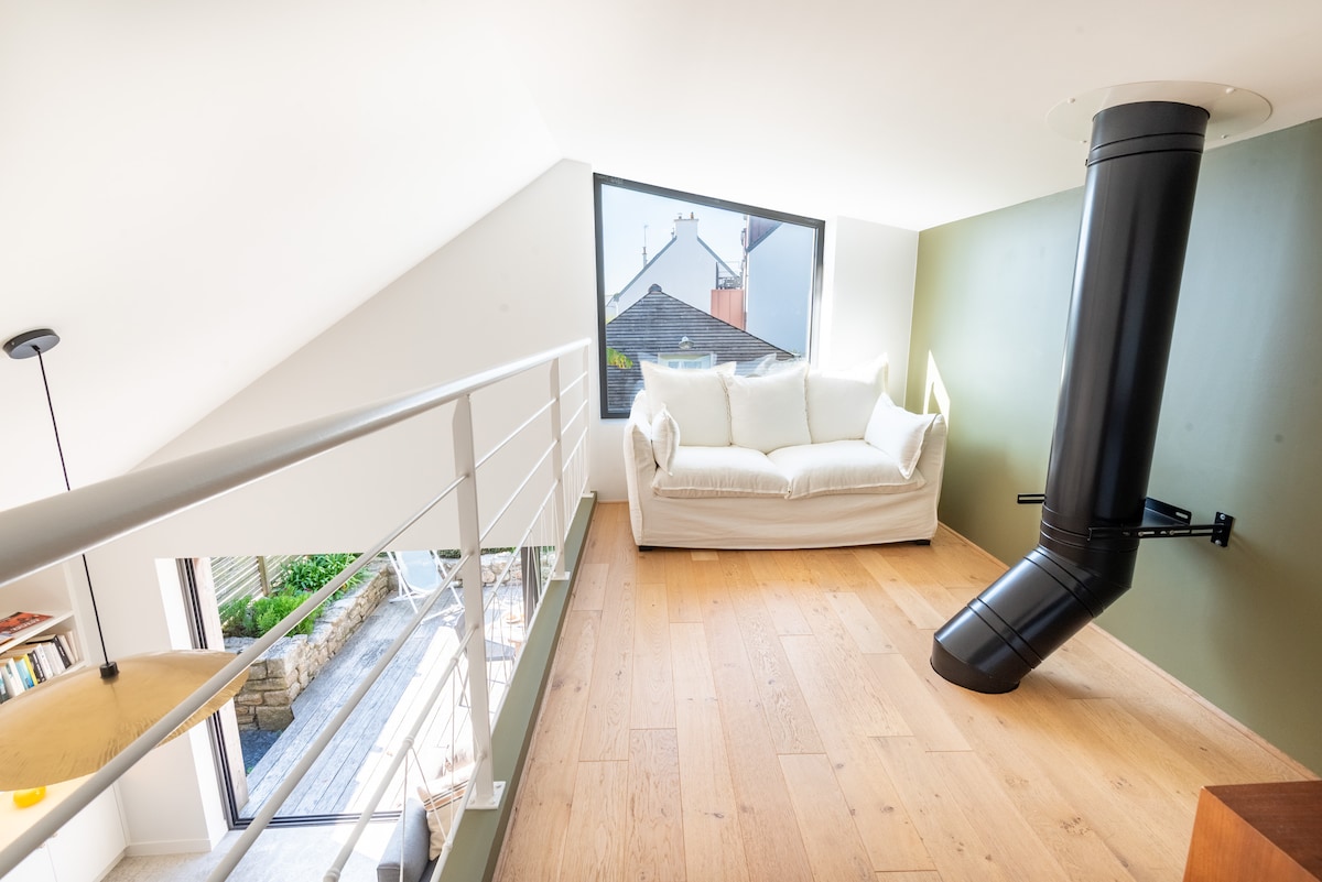 ○ Un espace salon & détente en mezzanine avec canapé et bureau ouvert sur le salon du rez-de-chaussée.