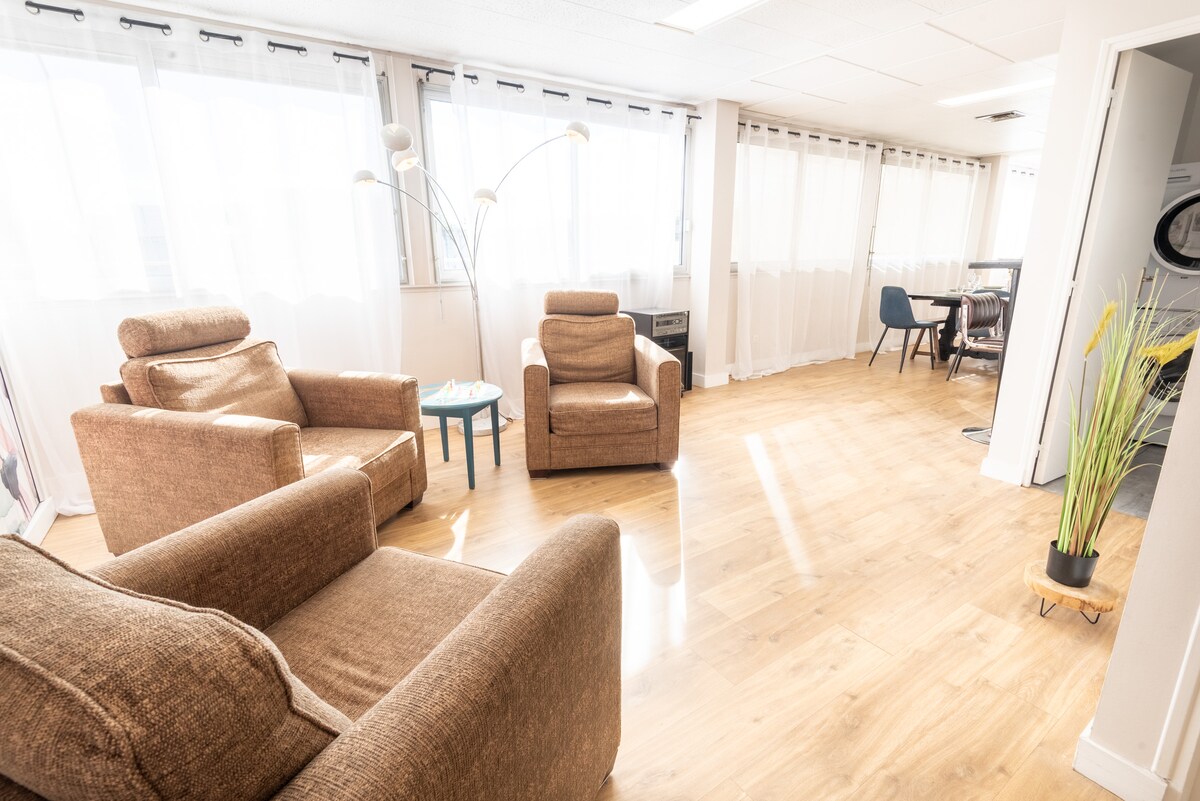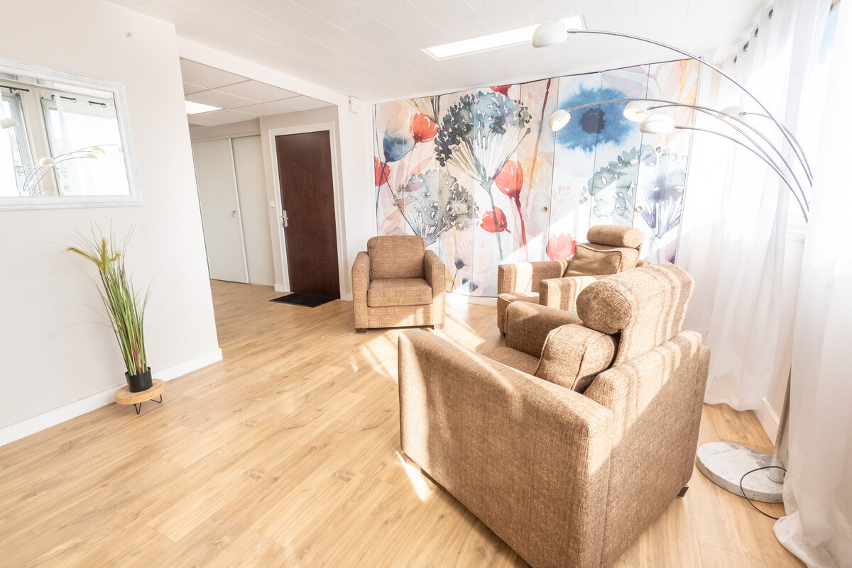 • A large relaxation area with a sofa, armchairs, coffee table, and HD TV with internet box