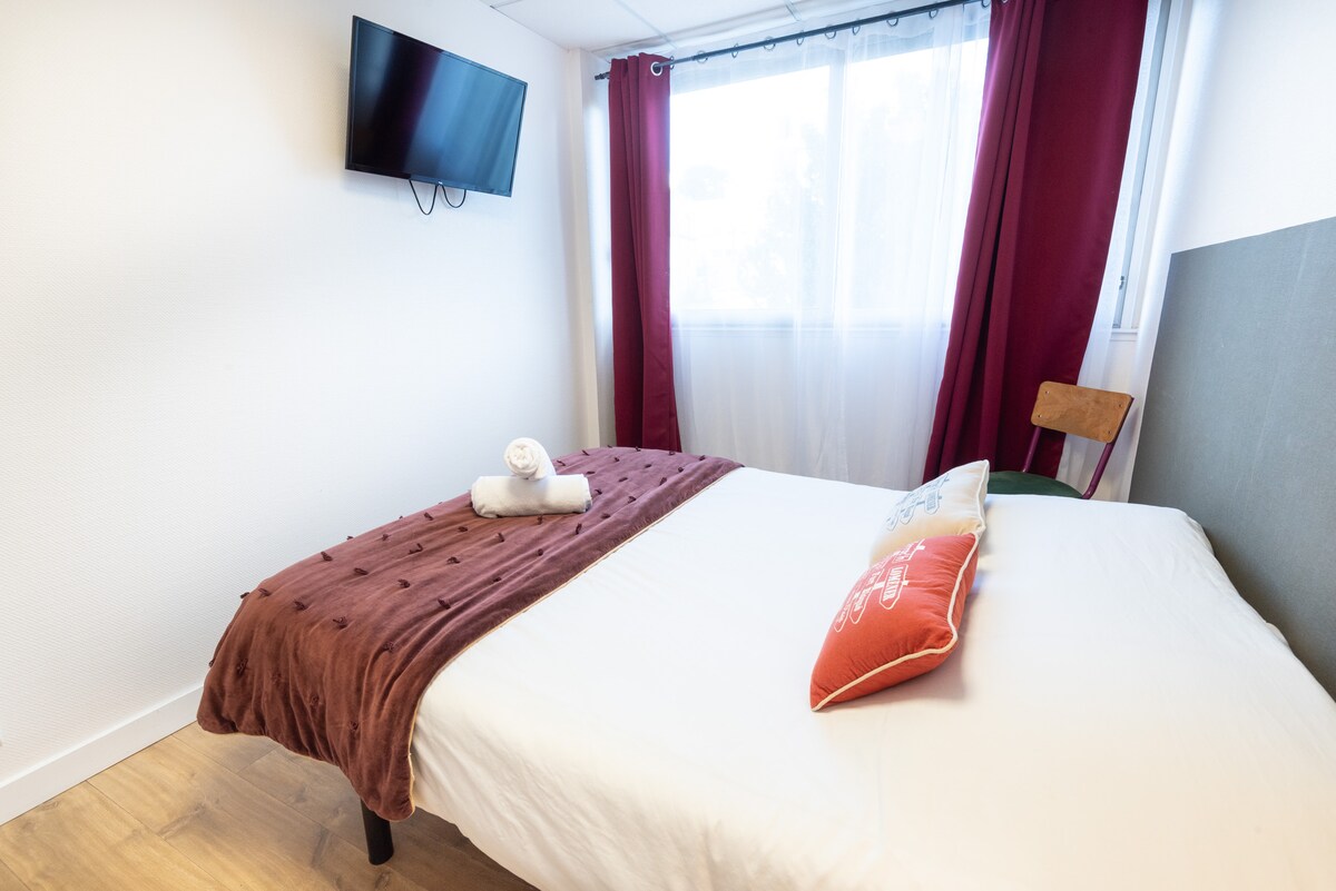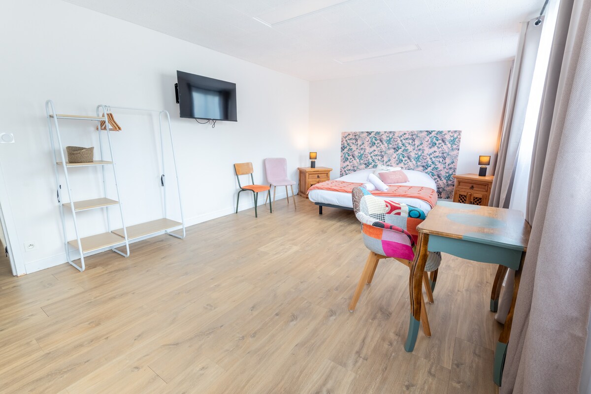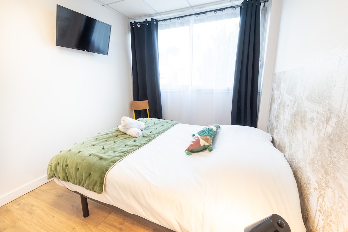 ► Bedroom 4 Kerroch': One 140 cm double bed, bedside tables and lamps, a clothes rack with hangers, and an HD TV. Blackout roller blinds.
