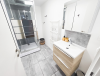 ► Bathroom 3 with vanity unit, shower, storage space, and towel dryer.